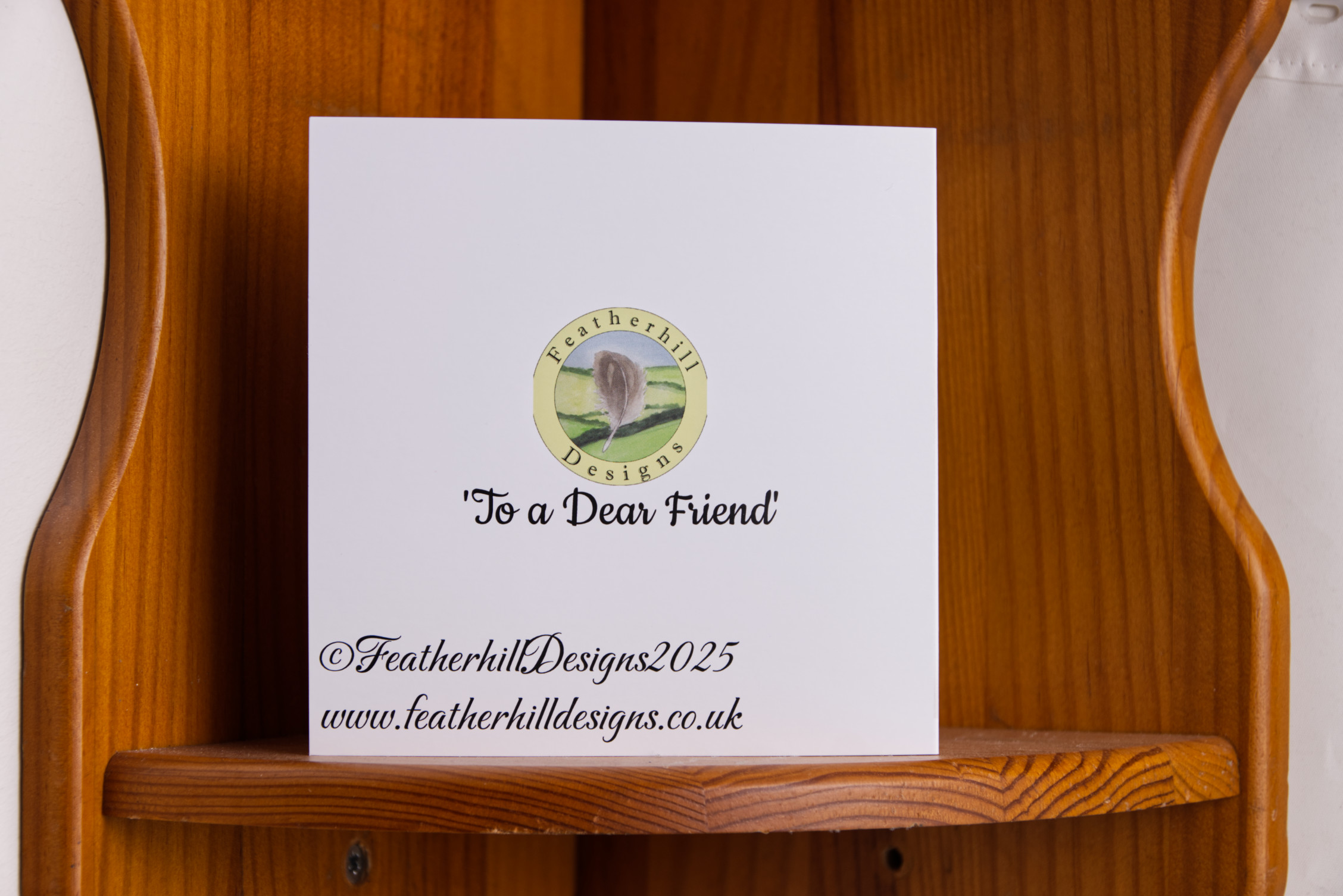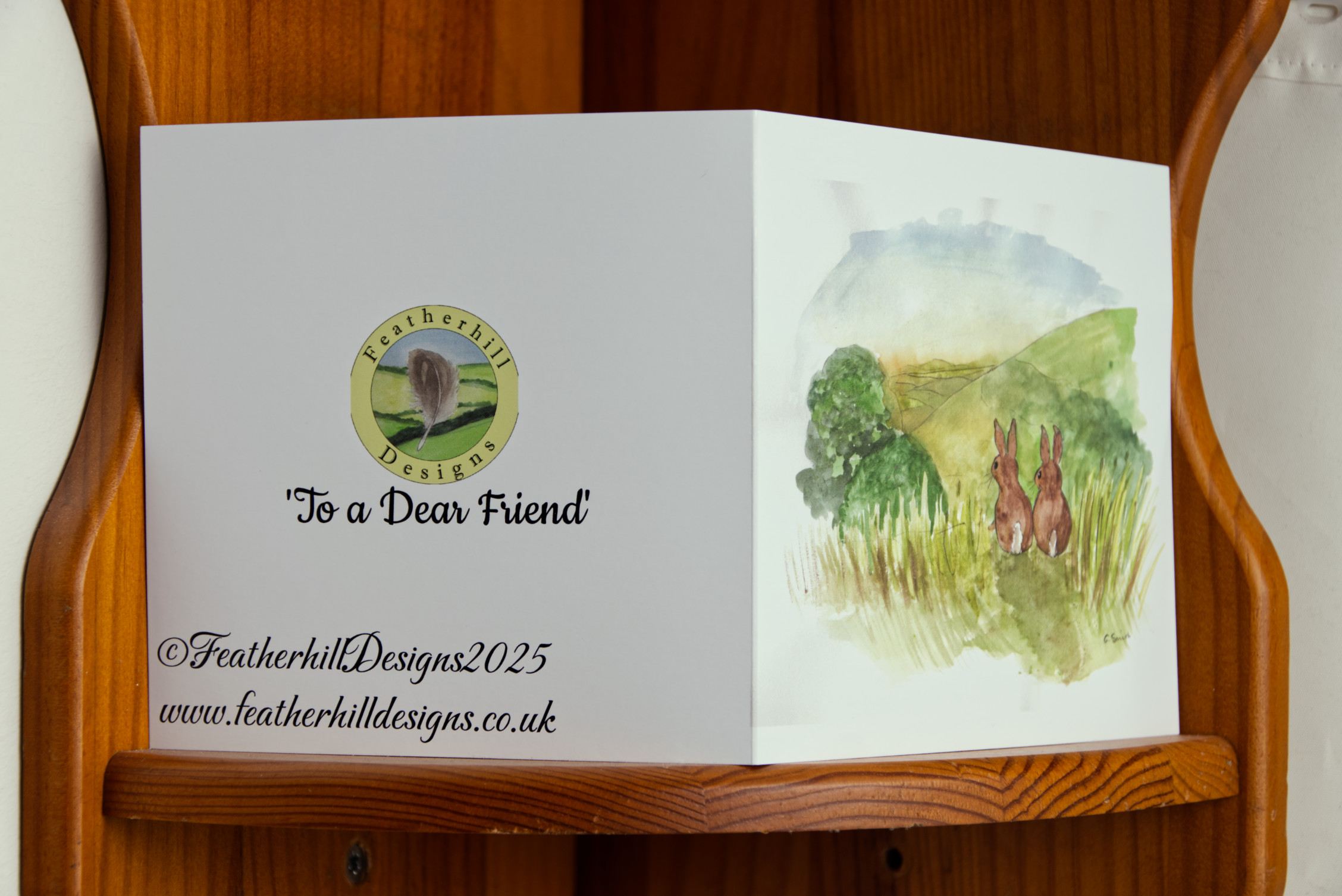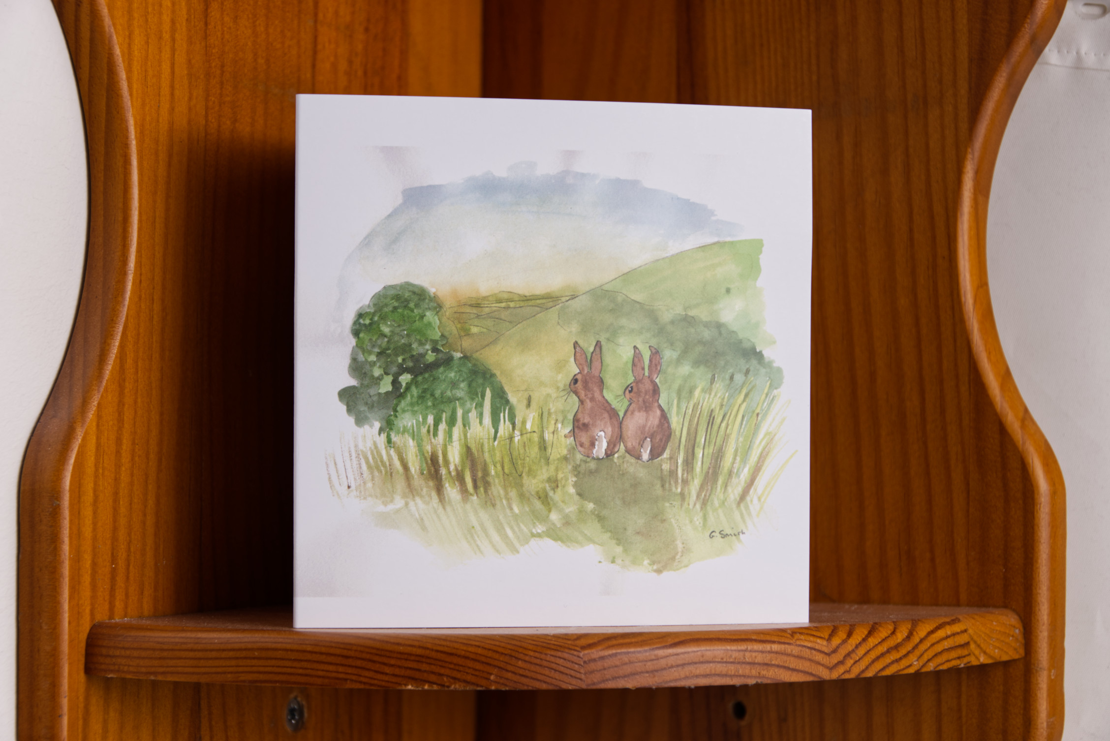 This greeting card depicts two rabbits watching the sun set over a North Devon valley. I have seen the sun set here myself – there is a warm, misty glow across the narrow valley and the hills either side. The card is 14 by 14 cm and is blank inside for you to put your own message in.