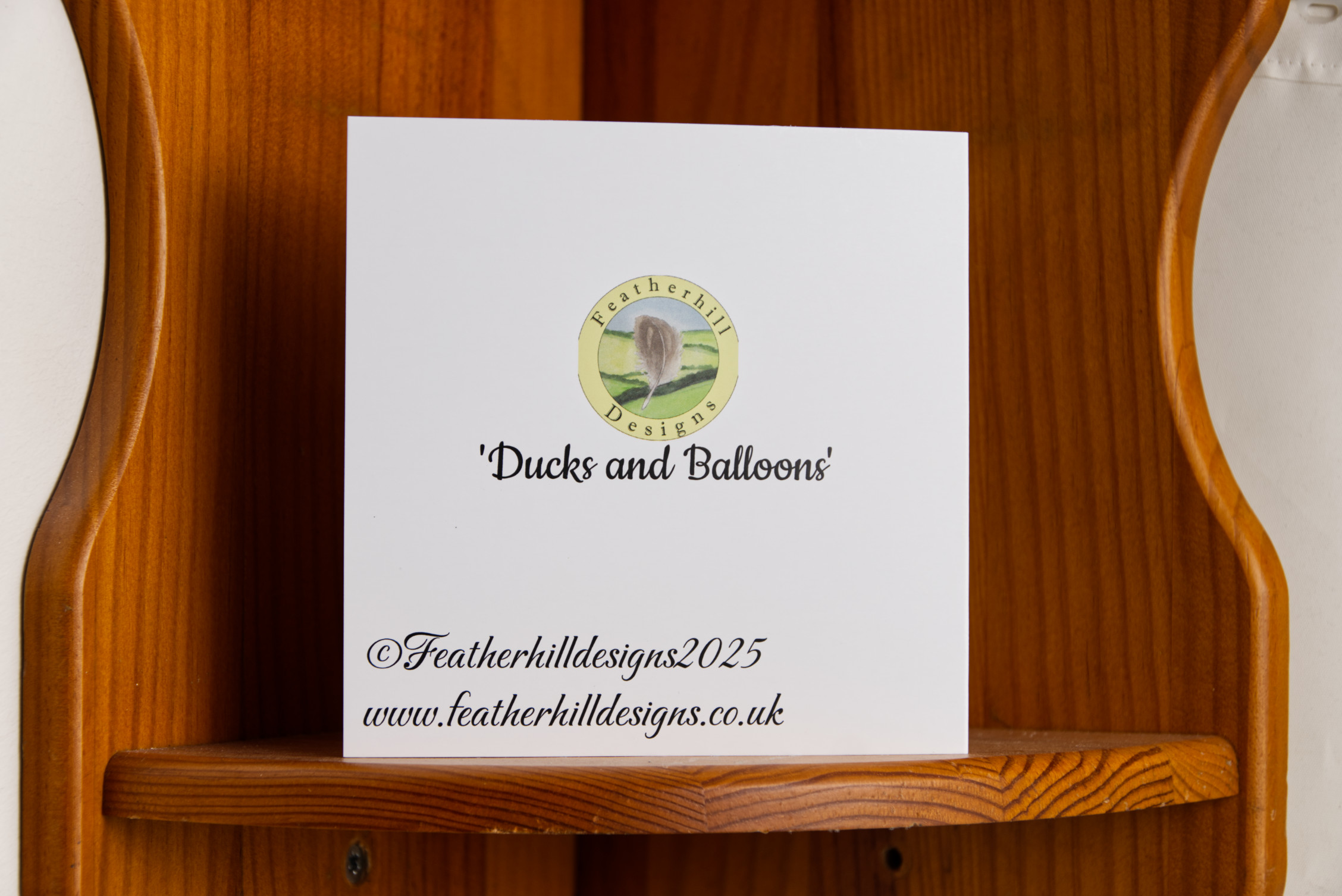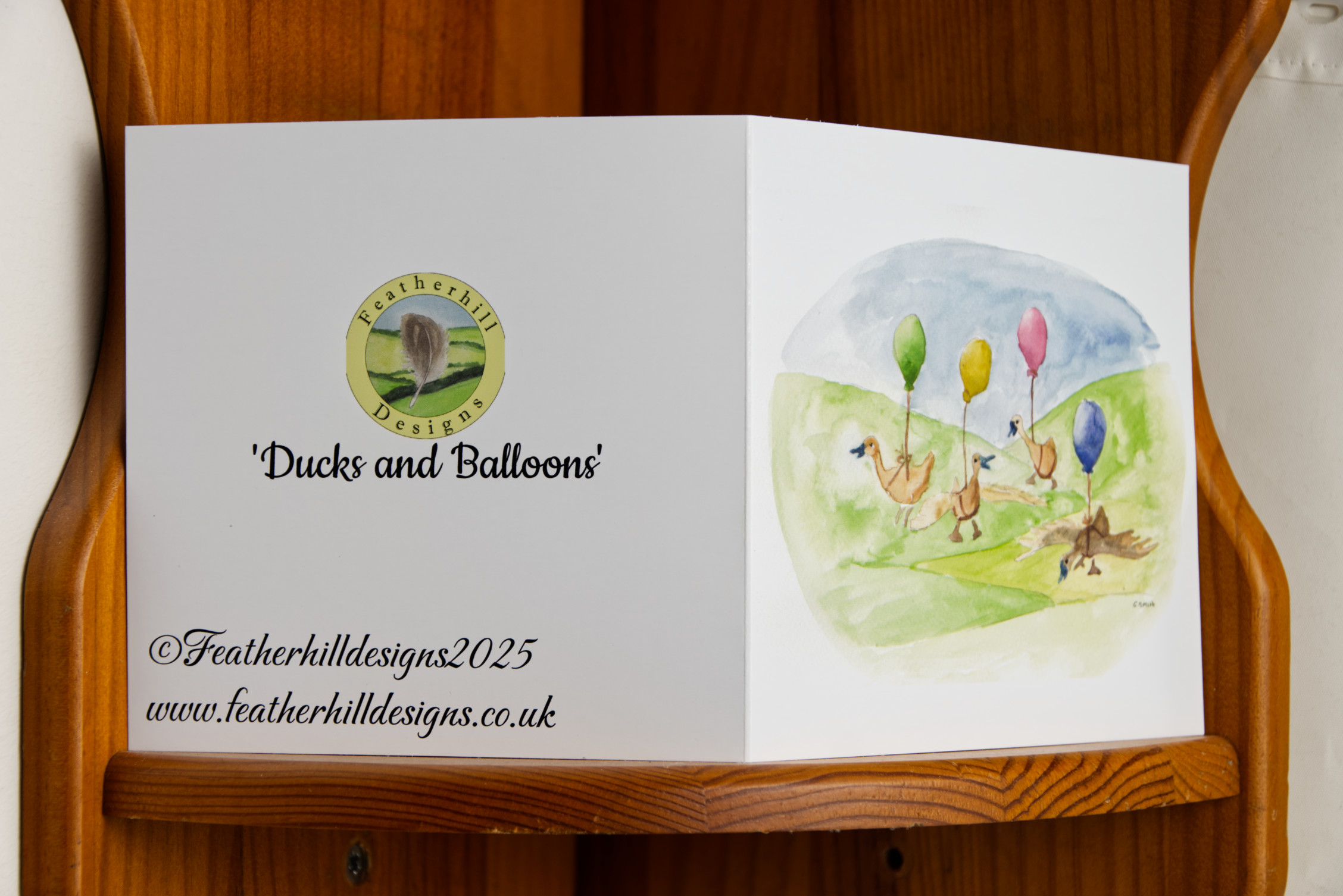 This cheerful card depicts my four ducks enjoying themselves as usual. If they knew how to use balloons, I’m sure they would try flying, in real life! Any owner of ducks will know of their strong characters, curiosity of ‘fun’ things and the way the whole ‘team’ will stay together. Somehow, watching them go about their way puts a smile on your face.